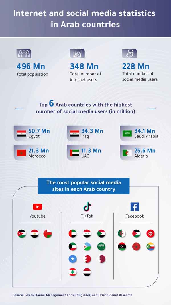 The number of internet users in the Arab region accounted for approximately 348 million, which represents 70.2 per cent of the total population of 496 million, according to a study conducted by Galal & Karawi Management Consulting, in collaboration with Orient Planet Research (OPR), one of the specialized units of Orient Planet Group (OPG). The study, which focused on digital transformation in the Arab World, further reported that social media usage has surged to 228 million users, or 46 per cent of the total population.